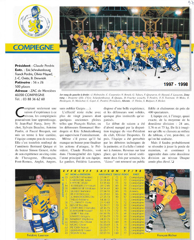 Lors de la saison 1996-1997, les Lions de Compiègne disputèrent donc pour la première fois de leur histoire, le championnat de France de la Division 2.